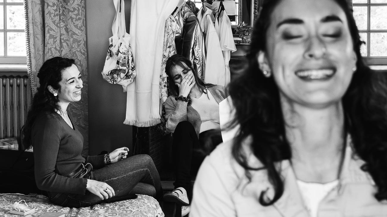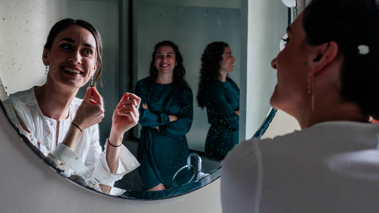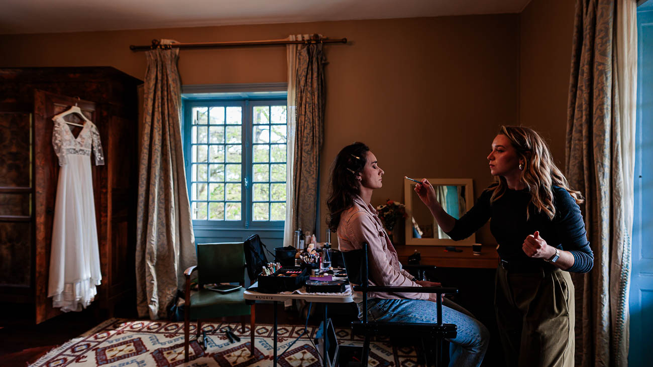 Pendant ces heures de préparatifs, une complicité unique se dessine entre Claire et ses amies. Ce sont des moments précieux, que nous aimons tant photographier : un regard échangé dans le miroir, une main tendue pour ajuster une boucle d’oreille, un éclat de rire libérateur. Ces gestes tendres racontent une histoire d’amitié, de confiance, et d’amour. L’ambiance est douce, feutrée, presque secrète.