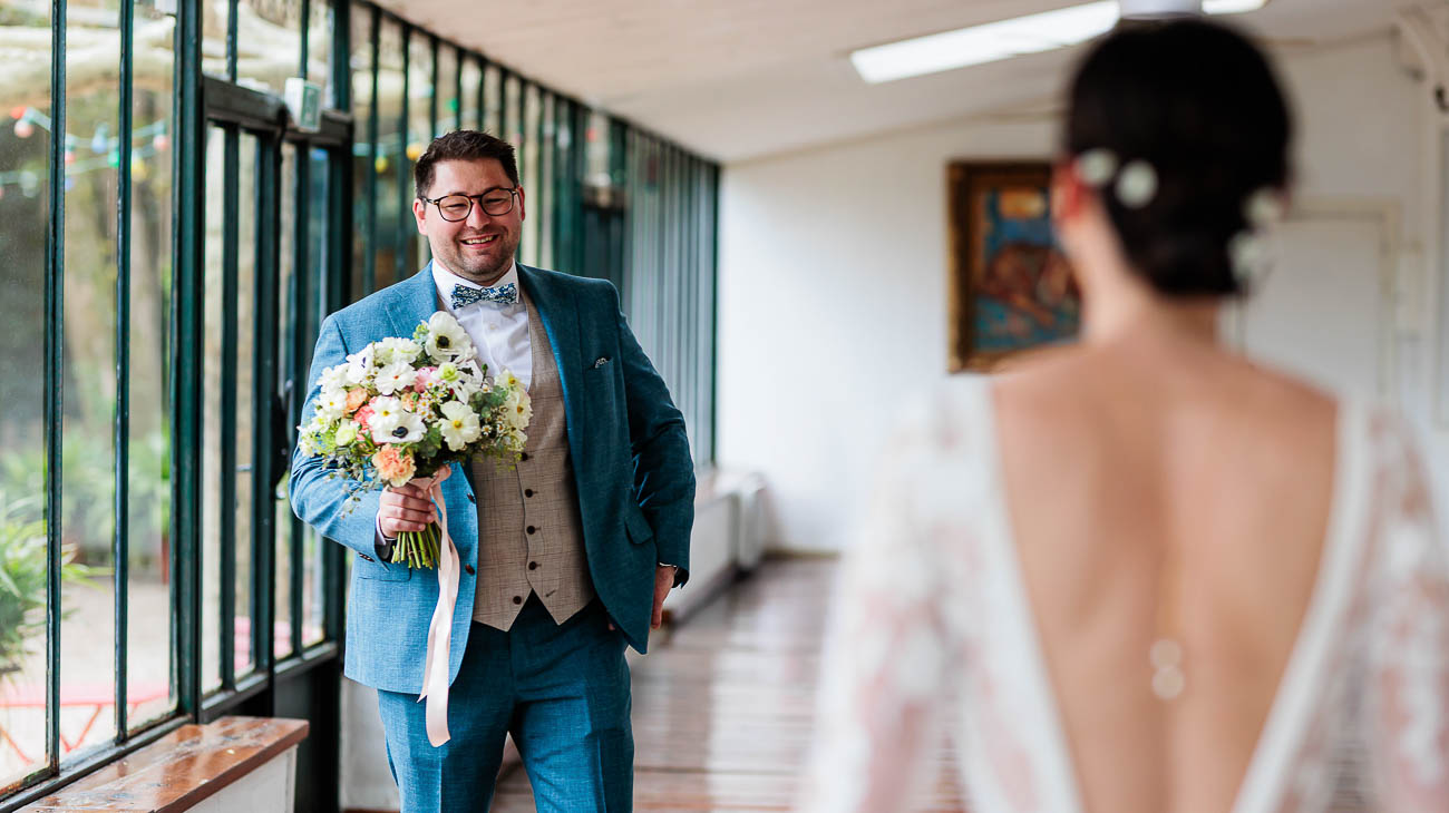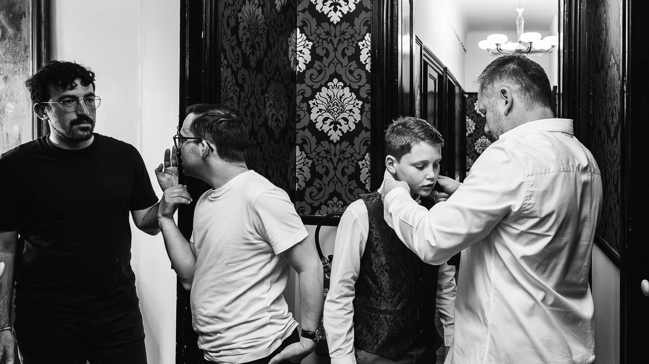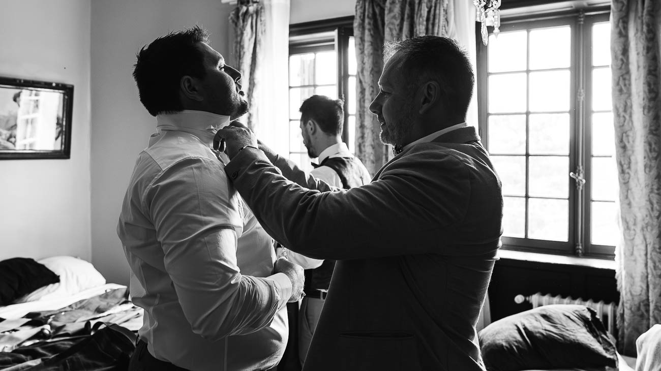 Pendant ce temps-là, Benjamin, lui, n’est pas encore dans le tourbillon du nœud papillon. Fidèle à lui-même, il veille à ce que tout le monde se sente bien : il accueille les invités qui logent sur place, répond aux questions, gère les petits imprévus avec calme et bonne humeur. Puis vient son tour : dans une autre chambre du domaine, il retrouve ses amis pour se préparer. L’ambiance est plus rythmée, ponctuée de blagues, de taquineries, de sourires nerveux. Moins solennelle, mais tout aussi chargée d’émotions.